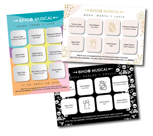 Dale al Bingo es la forma más original de animar un banquete de boda, romper el hielo y llenar la pista antes del primer baile. Un juego sencillo, divertido y personalizable donde las canciones sustituyen a los números… y el premio es ver a todo el mundo cantando a pleno pulmón.
